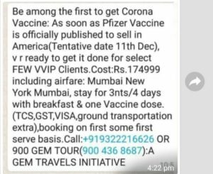 “Be among the first to get Corona Vaccine: As soon as Pfizer Vaccine is officially published to sell America (tentative date 11 December), v r ready to get it done for select few VVIP clients…” the travel operator said in its package details through WhatsApp messages.