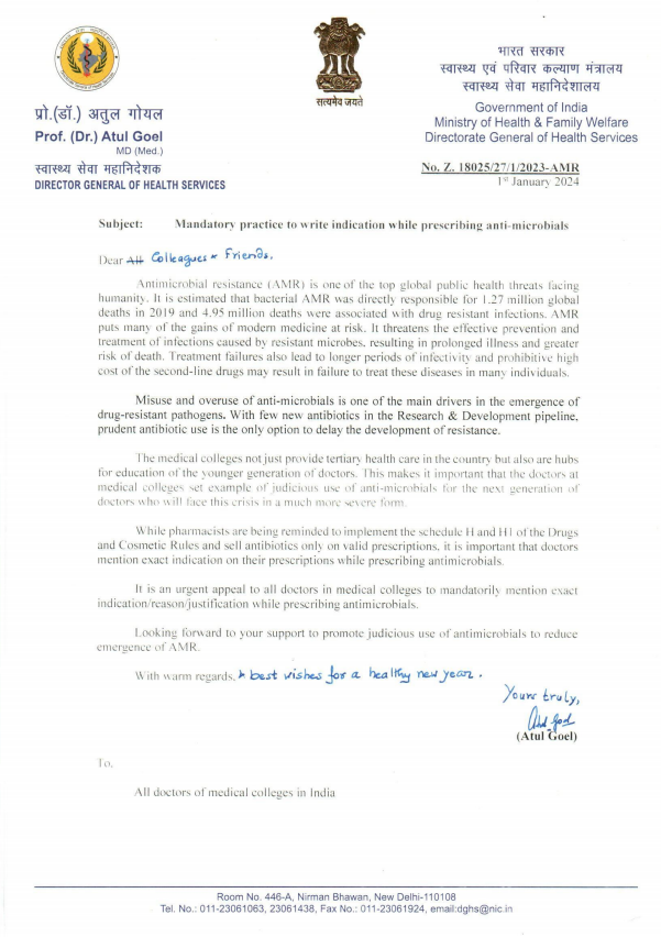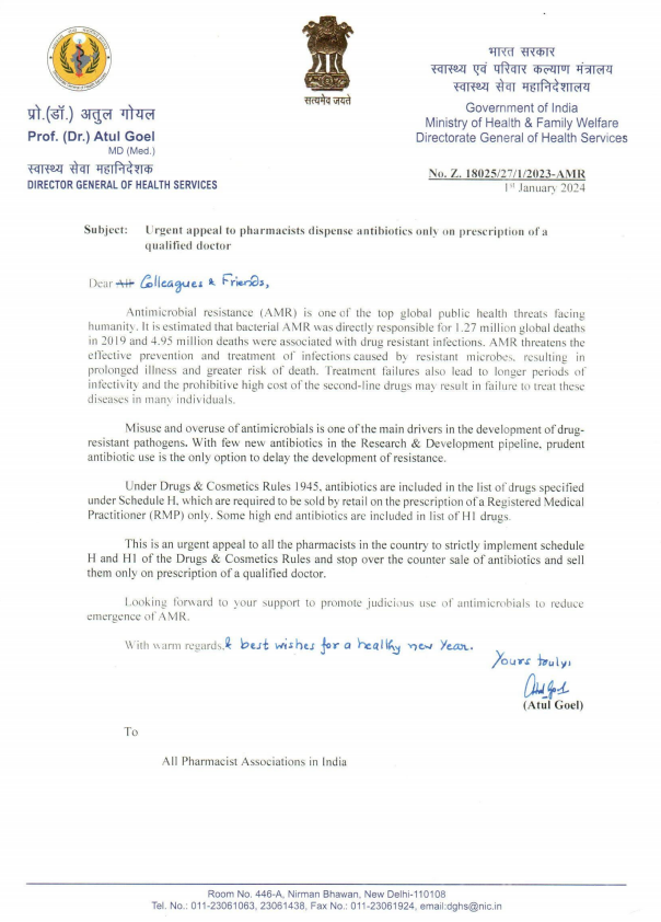 In an attempt to stop the misuse of over-the-counter antibiotic or antimicrobial medication in India, the Directorate General of Health Services (DGHS), a division under the Ministry of Health and Family Welfare has now made it compulsory for doctors to give exact indications while recommending such medications. The DGHS has specifically urged all medical professionals, doctors, medical associations, and pharmacist associations in the country to dispense antibiotic and antimicrobial drugs only on the prescription of a certified doctor. In the letter, health authorities from the DGHS have also asked them to curb the exercise of over-the-counter sale of antibiotics.