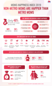 The surprising key finding of the study has been thatwhile 48% of moms across India are happy with their current state of life, moms in non-metro cities are much happier than those in metro cities. The survey also found that moms in non-metro cities rate themselves higher at being good moms, have happier marriages and have more supportive families. Unsurprisingly, the data indicated that moms in metros are much more stressed than moms in non-metro cities.