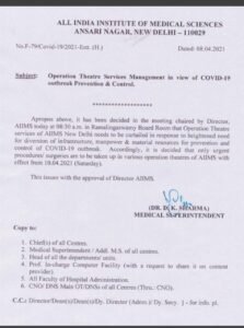 In the view of Covid-19 outbreak prevention and control, in a meeting chaired by the Director of AIIMS, it was decided to curtail the Operation theatre services Of AIIMS, New Delhi in response to a heightened need for diversion of infrastructure, manpower, and material resources for prevention and control of COVID-19 outbreak.