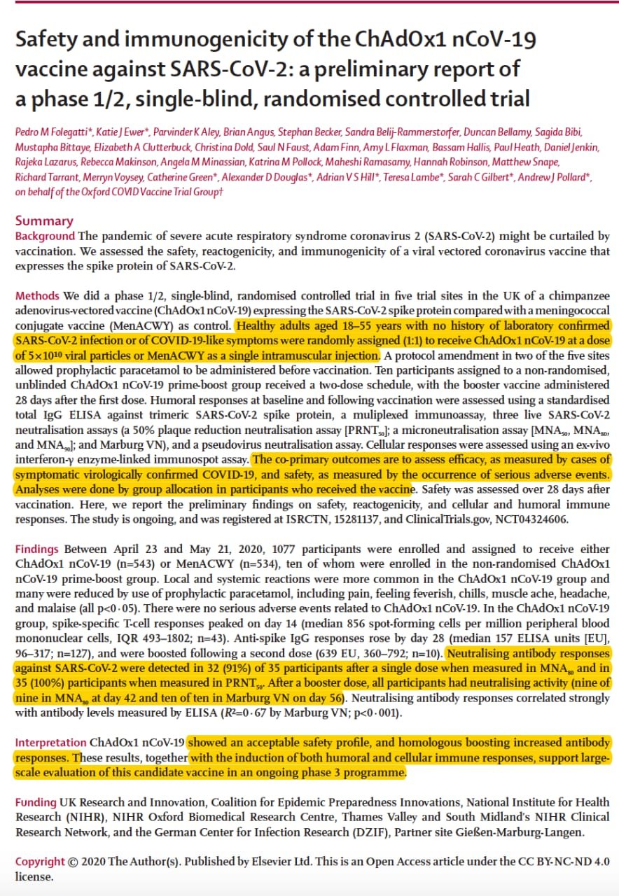 A preliminary report of phase 1/2 of the ChAdOx1 nCoV-19 vaccine candidate from the University of Oxford showed promising results in early human testing.