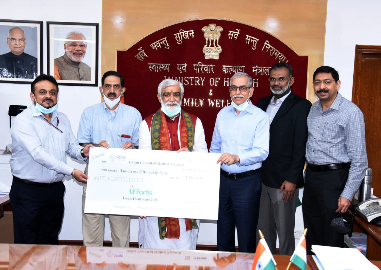 A leading private sector medical service provider Fortis Healthcare has handed over a cheque of Rs. 2.5 crore to the ICMR today in the presence of Shri Ashwini Kumar Choubey, The Minister of State for Health and Family Welfare.