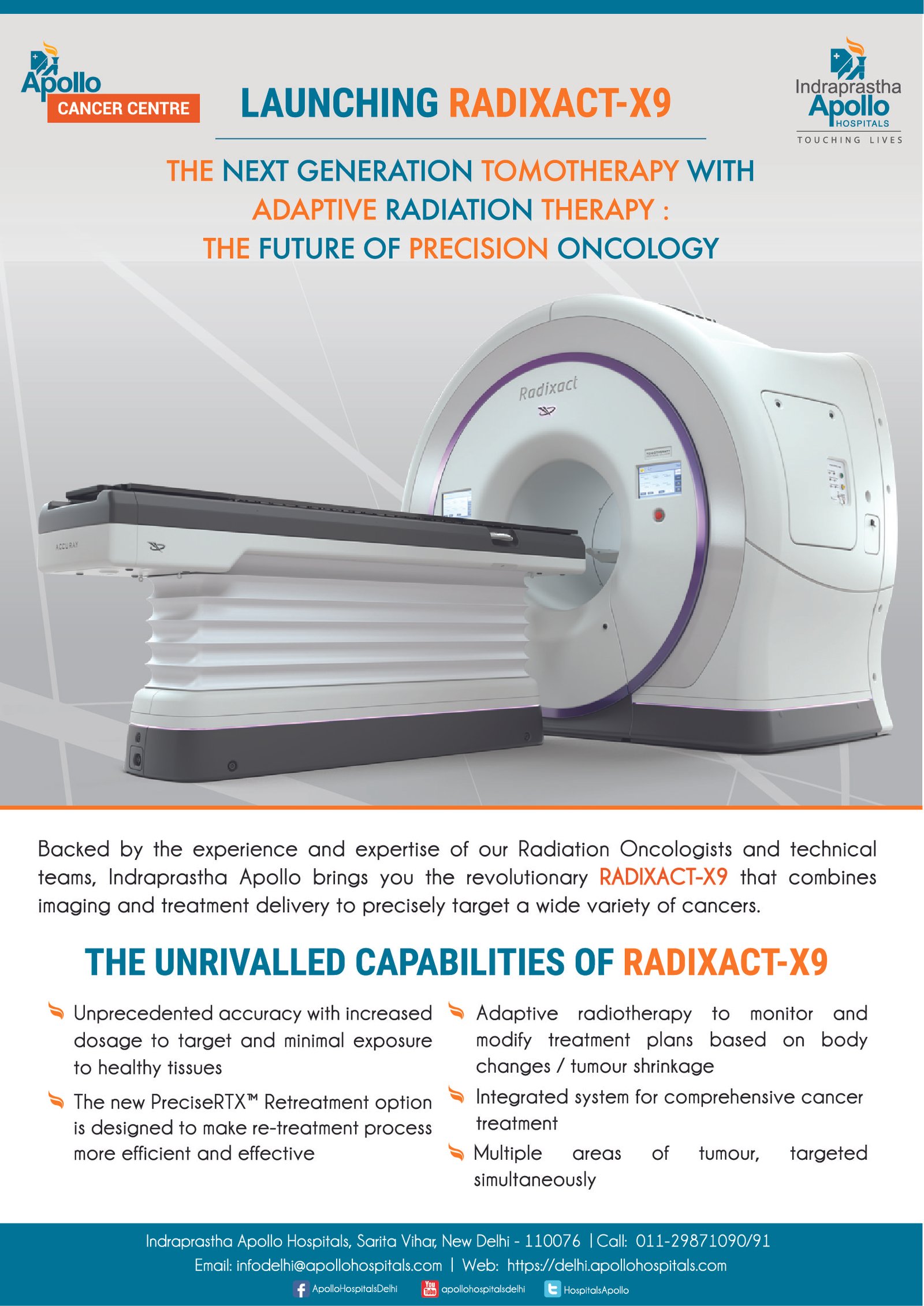 New Delhi, January 23-Indraprastha Apollo Hospitals has announced the launch of RADIXACT-X9, the state-of-the-art, advanced tomotherapy treatment machine with a cutting edge technology that combines imaging and treatment delivery to precisely target a wide variety of cancers.
