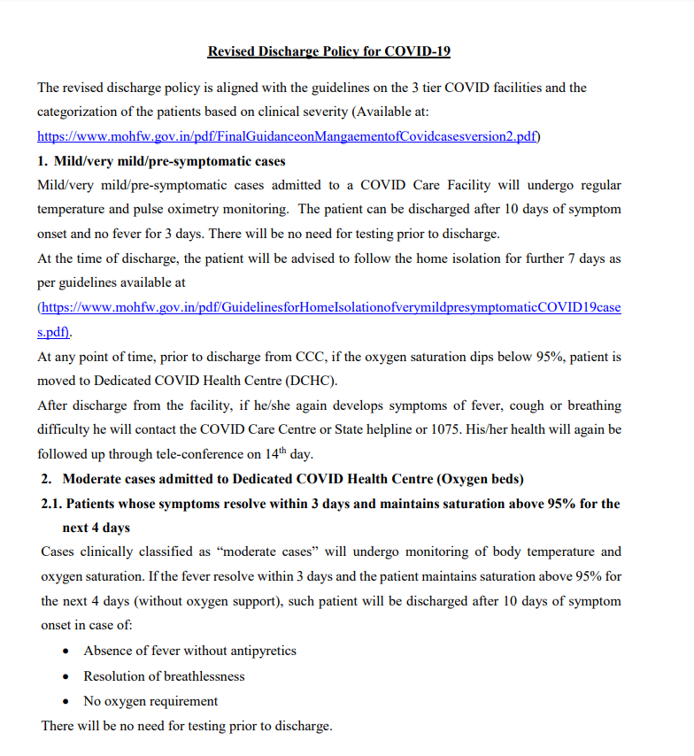 The revised discharge guidelines are in contrast with the government’s previous rules that said a laboratory confirmed case had to be tested on day 14 once and then again in a span of 24 hours — if both the results are negative then the patient is fit to be discharged from the health care facility.