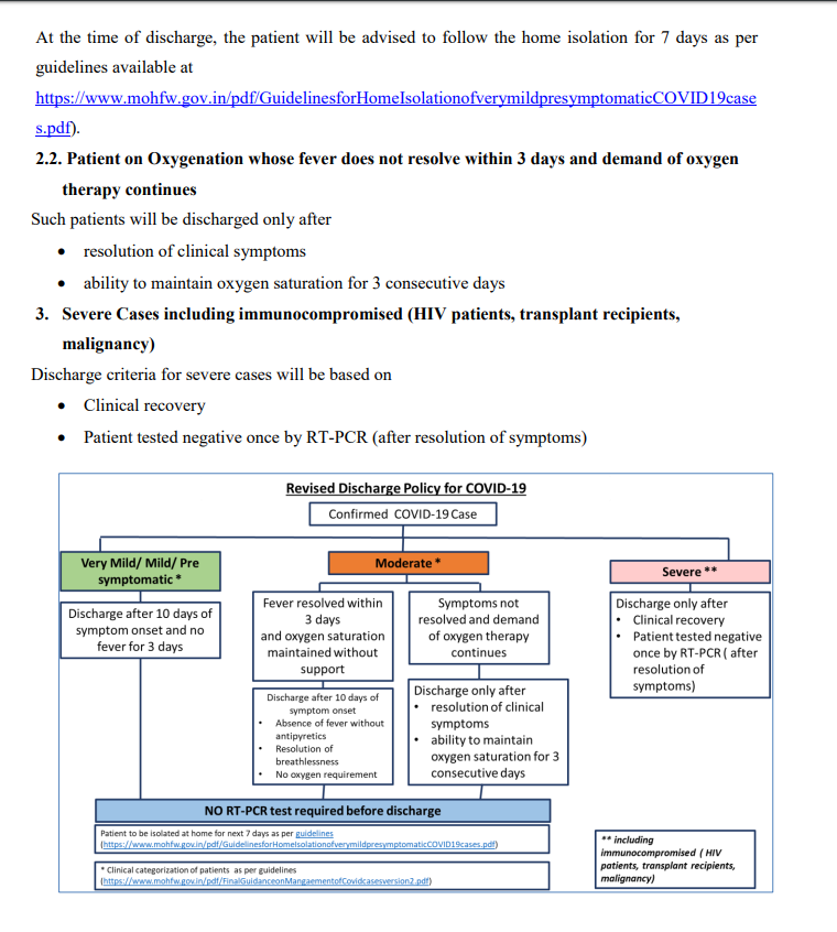 The other category of patients, including very mild, mild, pre-symptomatic and moderate cases need not be tested before discharge.