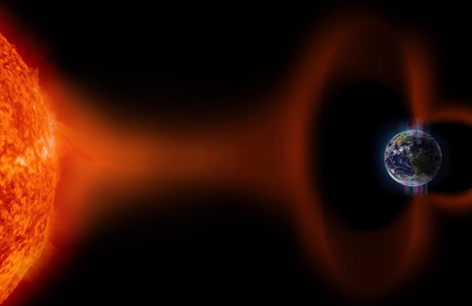 The resulting flux of charged particles travels millions of miles from the Sun to the Earth.