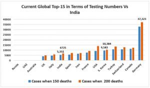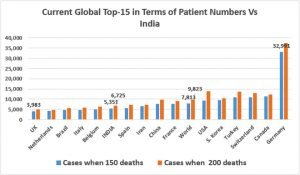Interestingly, three countries that have tested aggressively have yet to have 150 deaths, namely Russia, UAE and Australia. While Germany is clearly an outlier, with around 33000 patients when it had 150 deaths due to aggressive testing–also partly explained by the relatively younger population that got affected initially–most other countries have had higher but somewhat comparable numbers as that of India. The reasons behind this may differ from country to country and need to be studied further. However, it is interesting that global hotspots like UK, Italy and Belgium have had lesser number of cases than India when they crossed 150 as well as 200 deaths during the initial phase of the pandemic, perhaps explained by the older populations with a higher NCD burden. Even South Korea, a global example of aggressive testing had around 9500 recorded patients of COVID-19 as it crossed 150 deaths, surprisingly close to India’s 5351 patients.
