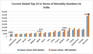 When we look at the current top 15 countries in terms of patient load and examine historical data, it becomes clear that while India has had lower than expected number of recorded patients when it crossed 150 COVID-19 deaths, it is by no means an outlier. India indeed had a lower number of patients (5351) as it crossed 150 deaths than the global average, but countries like UK, Netherlands, Brazil, Italy, and Belgium, had an even lower levels of recorded number of patients at that time. When the current top 15 countries in terms of mortality load is examined, overall, the same countries remain in the list – although South Korea is replaced by Sweden. Sweden had recorded 4239 patients as it crossed 150 deaths, as against India’s 5351.