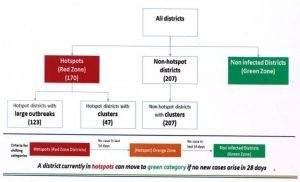 Union health ministry on Wednesday said that it has identified 170 districts as hotspots of novel coronavirus outbreak and 207 districts as non-hotspots while the rest have been categorised as green zones.