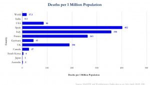 India has 0.3 deaths per million population, as compared to 86 in the US, 402 in Spain, 358 in Italy and 190 in the UK, 263 in France, 45 in Germany and one in Japan.