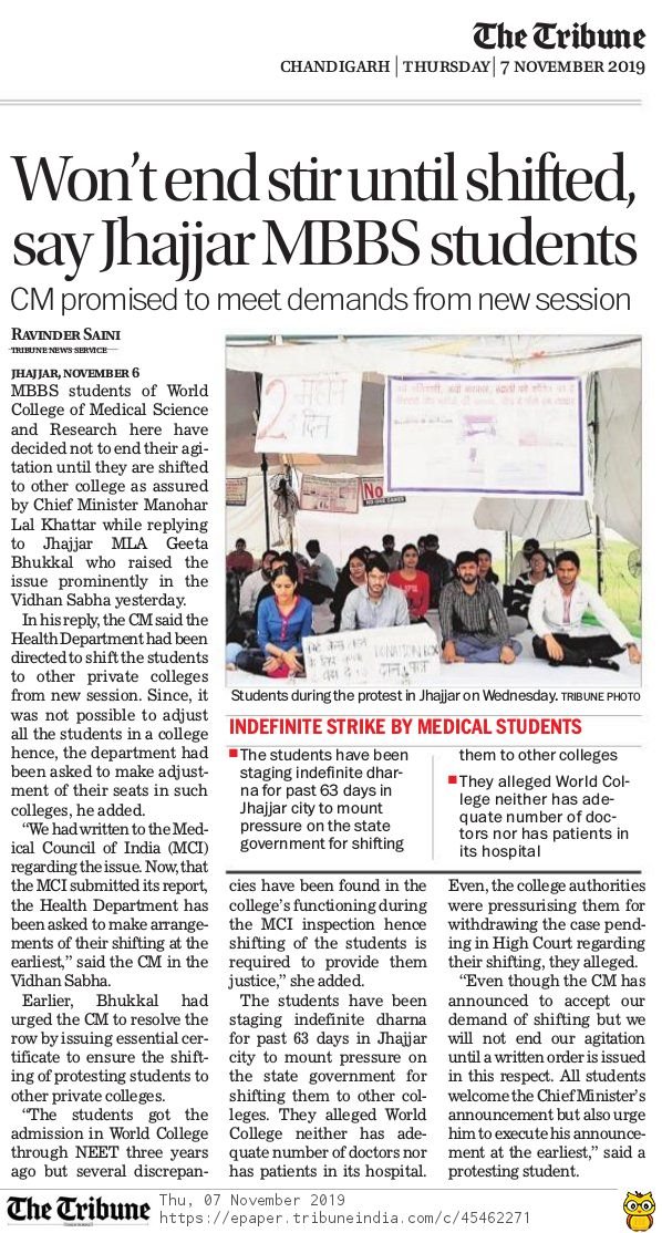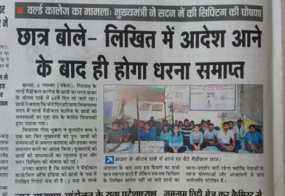 Students of World College of Medical Science & Research, Jhajjar has written a letter to the office of the President of India, Prime Minister of India, Chief Justice of India, Chief Minister of Haryana, and Chief Justice of Punjab & Haryana High Court seeking permission to end their own life.