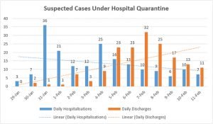 Given this context, Kerala’s response to Covid-19 has been remarkable. Kerala has been publishing daily updates about quarantine, tests and hospitalisations. Reportedly, two out of the three patients infected with Covid-19 have now tested negative. However, given the close linkages between Kerala and Wuhan, both hospital based and community based quarantine efforts are actively on. Of the 11,500 individuals presently under community surveillance in 34 States/UTs across India, around one-third are in Kerala alone. A day-wise graph of hospital based and home-based surveillance is given below.